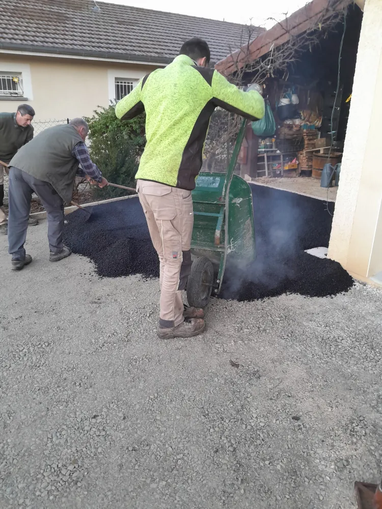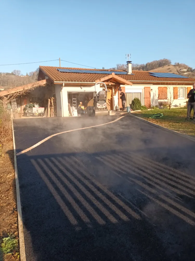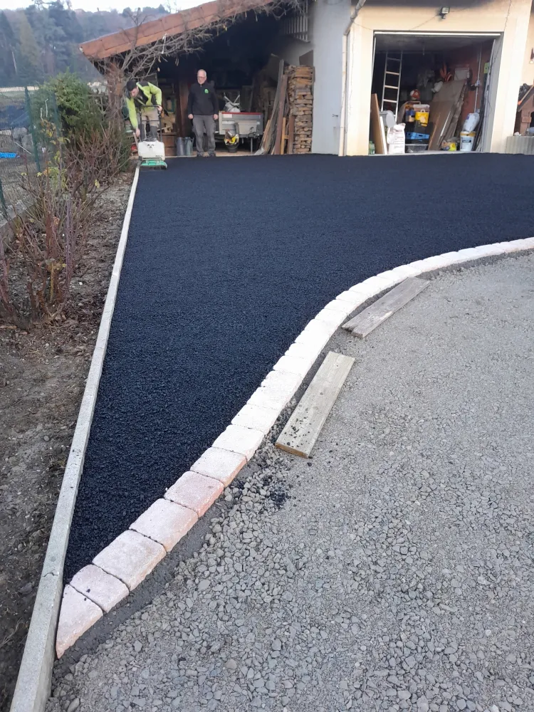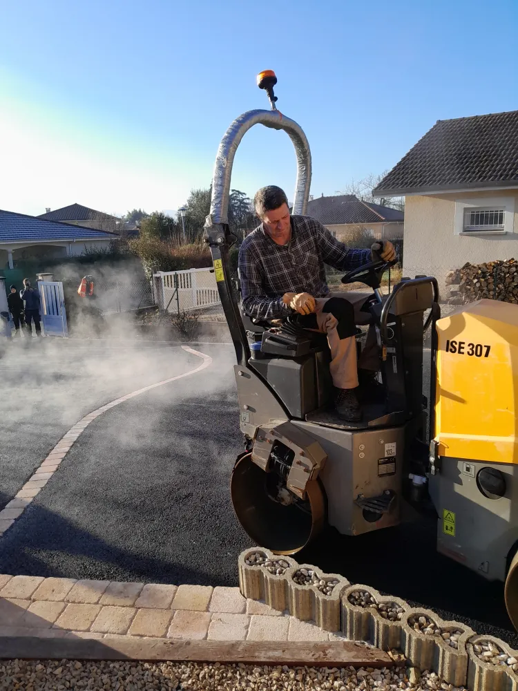 L'entreprise Stéphane Bousson Paysagiste située à Chatte est intervenue chez un client pour la réfection de sa cour sur 110 m2 en enrobé à chaud avec la pose d'une ligne de pavés pour crée 2 zones